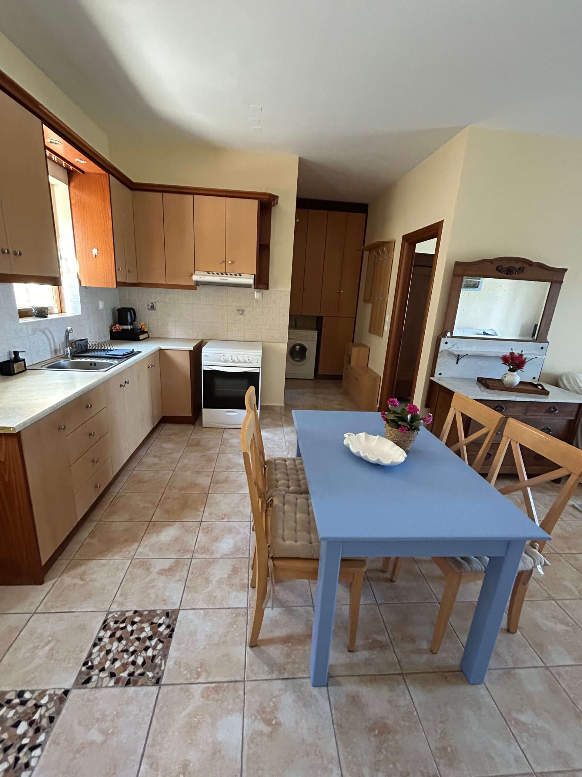 First-floor apartment with 1 bedroom, 1 double bed, 1 sofa bed, private bathroom with shower, kitchen, dining area, and large balcony with sea view. Quiet location near the sea.