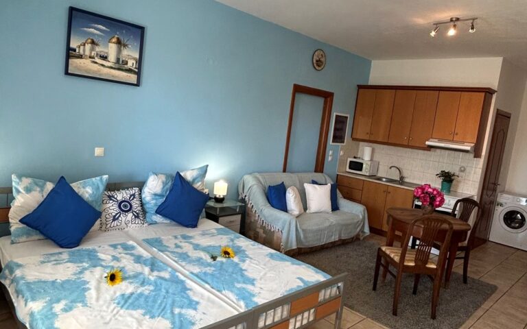 Orea Eleni offers private holiday apartments and studios in Vromolithos, Leros, just 50 metres from the sea. These family-friendly island apartments with balconies and sea or garden views are ideal for guests looking for a quiet stay near Panteli Beach, Vromolithos Beach, the port, and the town centre.